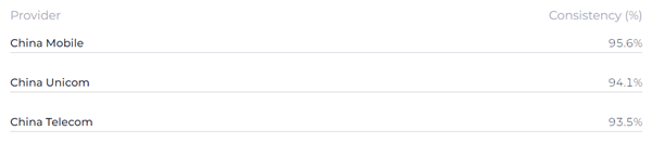 在網絡穩定性方面,則是中國移動以95.6%的穩定性排名第一,而中國聯通和中國電信分別以94.1%和93.5%的穩定性位居第二第三。