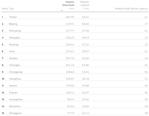 至于各個大城市寬帶速度方面,天津以284.90Mbps的中位數下載速度一騎絕塵,北京則是以249.71Mbps的速度位居第二,沈陽、上海和南京分別位居第三、四、五位。