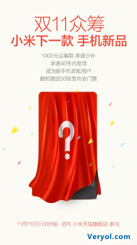 對于小米新機的詳細信息目前還不得而知,不過從小米手機官微我們得知,這款手機有四大亮點,不知會不會配備主流的指紋識別與全金屬機身,同時神秘新機將采用全民眾籌的方式進行搶購,支付1000元40天之內發貨,產品定價后多退少補,11月11日0點起,小米天貓旗艦店,同時將有機會獲得發布會門票。