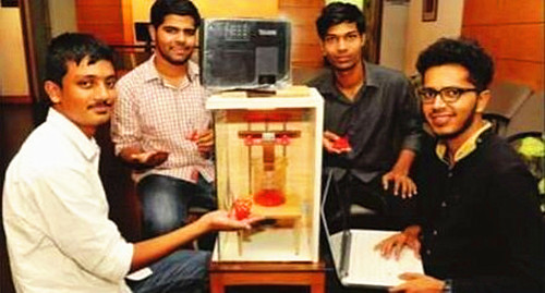 據介紹這幾名學生全都是來自印度班加羅爾的一所大學的機械工程學院的在校生,他們根據自己所學知識采用了諸如厚木板、電路板、電動機、投影儀、燒杯等最簡陋的工具,在學校的一位教授的指導下完成了這架3D打印機。
